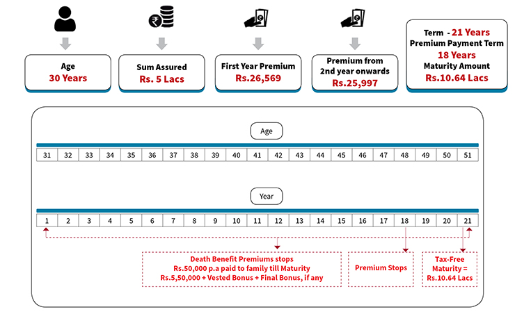 • In case of any unfortunate event premium ceases & Annual Income Benefit is paid to the family every year till maturity which is 10% of Sum Assured. On Maturity, 110% of Sum Assured is paid along with vested Bonus & final bonus, if any