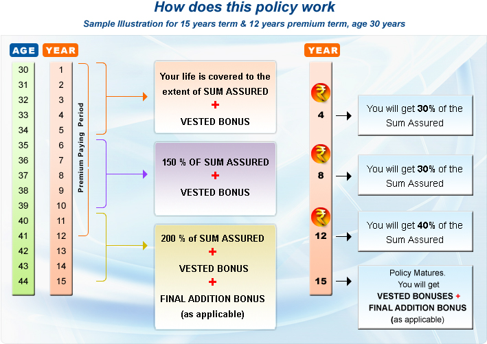 • Survival benefits are payable at regularintervals (see table below). Full sum assured is paid back by the end of the premium paying period.