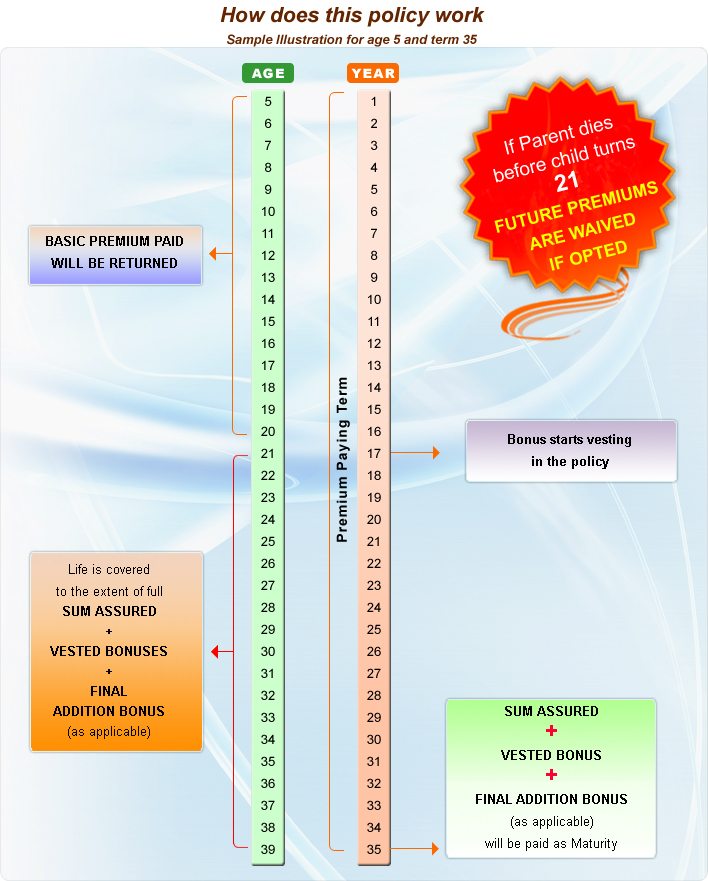 • Policy vests at the age of 21 (I.e.: life cover on the child and bonus vesting starts)
